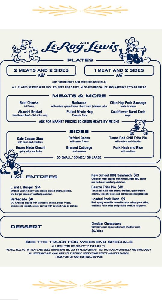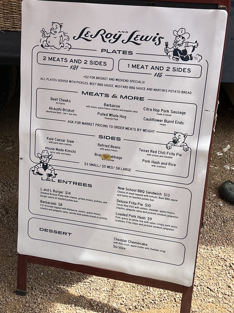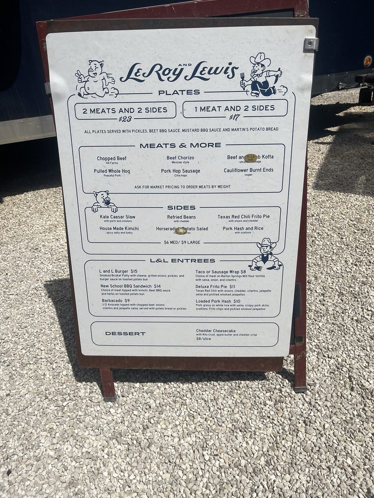 Leroy and Lewis Barbecue, located at 121 Pickle Rd in Austin, TX, is a must-visit for BBQ enthusiasts. This hipster, casual spot offers a wide range of options, including many vegetarian choices. The menu boasts unique dishes like the Smoked Brisket Patty burger, which impresses with its flavorful smoked brisket and perfectly balanced toppings. The Frito Pie and hash are also fan favorites, praised for their rich flavors and reasonable prices. The staff's friendliness and attention to detail enhance the overall experience, making it a memorable outing. With an array of amenities like outdoor seating, Wi-Fi, and compostable containers, Leroy and Lewis Barbecue ensures a comfortable and eco-friendly dining experience. Be sure to stop by and savor their delicious offerings, including the acclaimed L&L Burger and delectable sides.